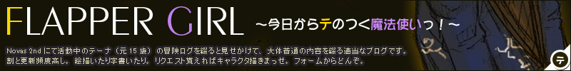 Novas 2nd にて活動中のテーナ(元15歳)の冒険ログを綴ると見せかけて、大体普通の内容を綴る適当なブログです。 割と更新頻度高し。絵描いたり字書いたり。 リクエスト貰えればキャラクタ描きまっせ。フォームからどんぞ。